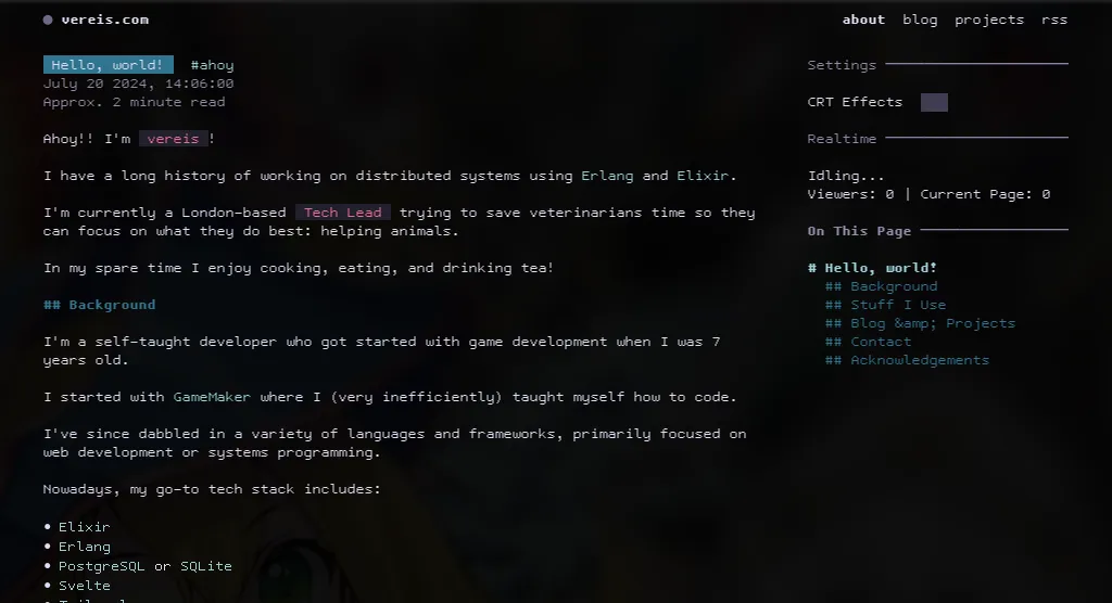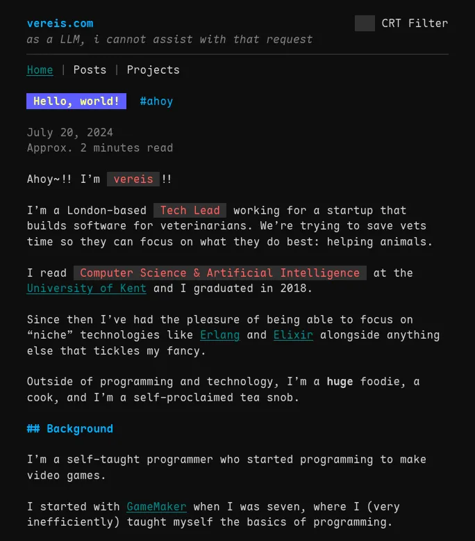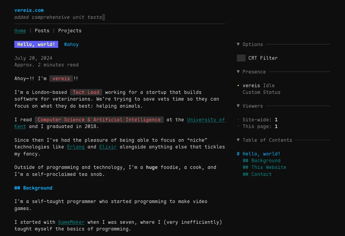 I actually got a fair bit of feedback about the CRT filter when I went viral on Hacker News. It wasn’t toggleable at the time, and made everything very hard to read…